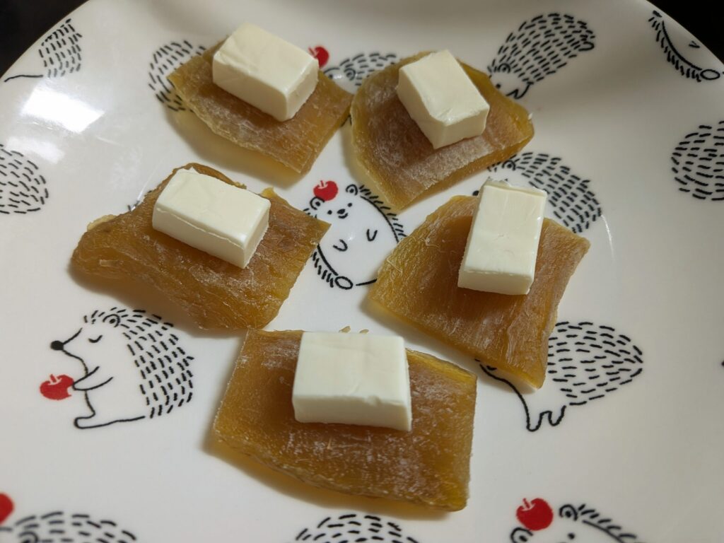 干し芋の上にクリームチーズをのせるだけなのですが、クリームチーズのほんのりした酸味と干し芋の甘味が絶妙に合わさって、高級なスイーツを食べているような感覚になります。