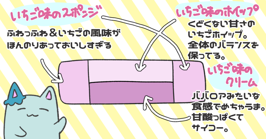 私は最近甘すぎるものが辛くなってきたのですが、このロールケーキはくどくなくて凄くおいしく食べられました。何より、いちごの良さを、スポンジ、ホイップ、クリームのすべてから感じられるので、いちご好きさんにはぜひ食べてほしいなと思いました!