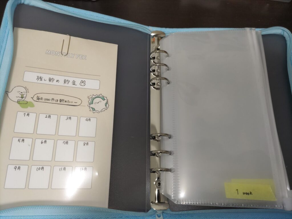 ファイルに別売りのリフィルと、残し貯め貯金用の封筒を入れています。週予算ごとに、リフィルに『1week』『2week』…といった感じでマスキングテープを貼っています。