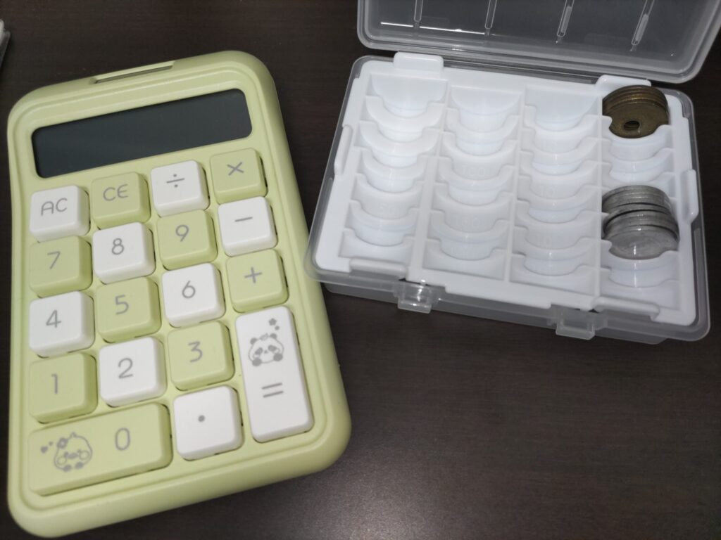 電卓はSHEINという通販サイト、コインケースはダイソーで購入しました。家計管理グッズが可愛いとモチベーションが上がるので、お気に入りのものを探してみるのがおすすめです!