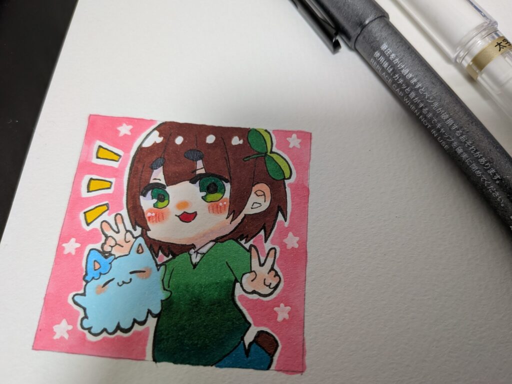 葛藤しながら、なんとかイラストが完成しました。今回、私は、マルチライナーというペンで線画を描いて、コピックチャオで色塗りをしています。周りの星部分はシグノの白ボールペンを使用しています。(下にリンク一覧を貼っておきます)